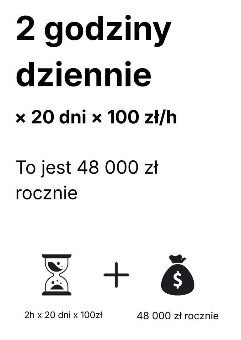 (2 h dziennie × 20 dni × 100 zł/h = 48 000 zł/rok)
